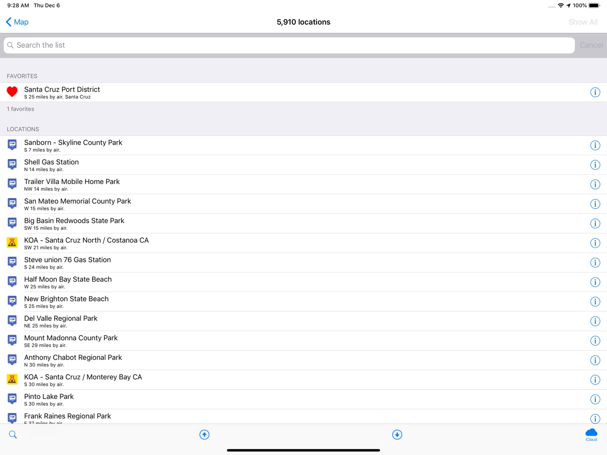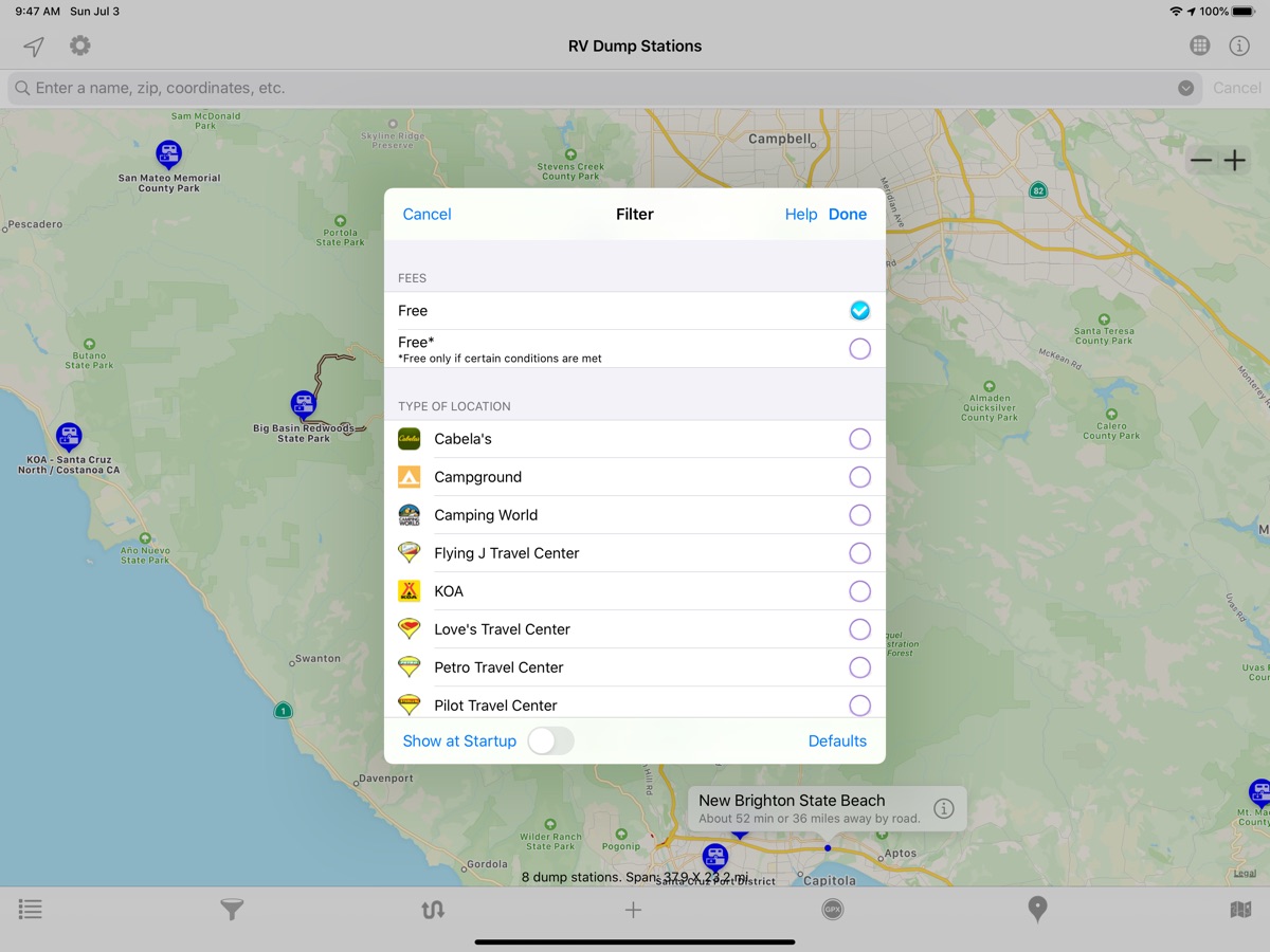 — Filter what type of location to display. For example, list only free dump stations from the filter.