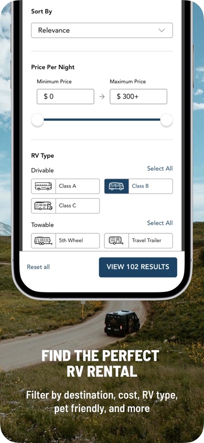 Explore with ease — Browse over 100,000 motorhomes and trailers, save your favorites, and share your perfect RV rental with friends and family. Options are available to fit every budget and include motorhomes, travel trailers, campervans and pop-up campers. Search filters for pet-friendly rentals, RVs that can be delivered to your campground, and trailers that your vehicle can tow make it easy to find the right option for you.