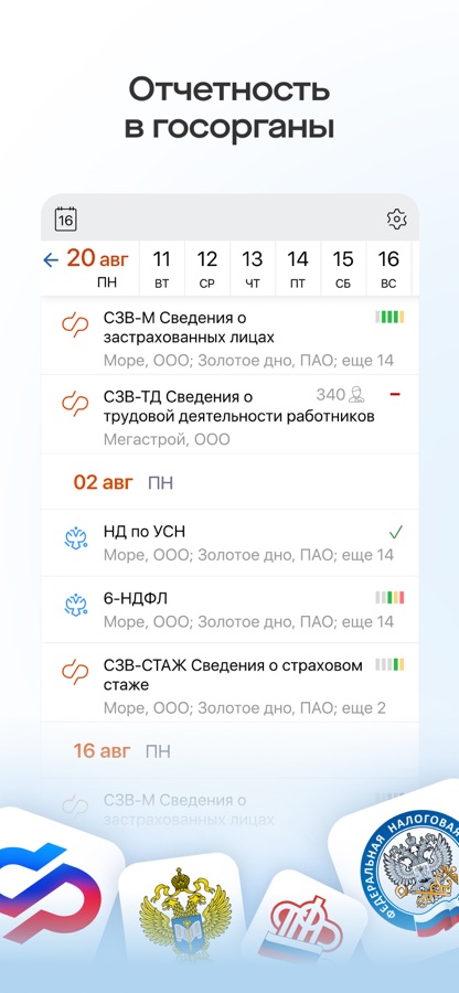 • Отчетность в госорганы – просматривайте отчеты в календаре Saby и следите, какую форму сдавать следующей, контролируйте статусы отправки.