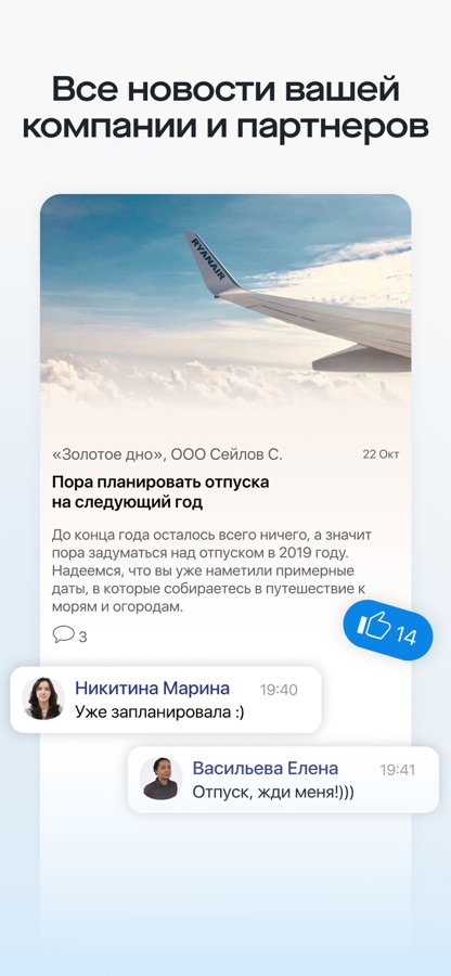 • Лента новостей — об изменениях в компании, новых приказах, лайки, репосты, комментарии.