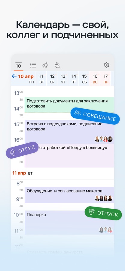 • Рабочий календарь — свой и коллег, оформление отпуска, отгулов, больничных и командировок.