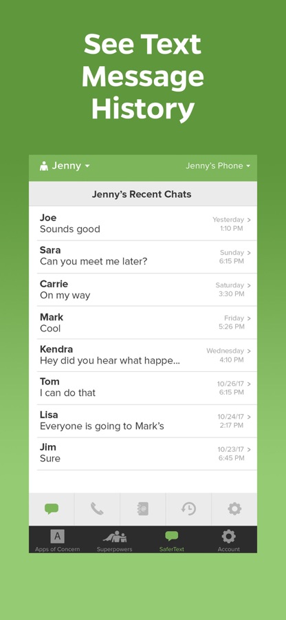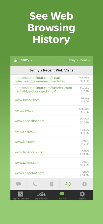 SaferText is a breakthrough child safety tool that allows you to see your child or teen’s text messages, web browsing history, phone call history and phone contacts. To keep trust in your family, your kids will know that you have SaferText, and you can gradually disable its features as kids get older to give them more privacy.