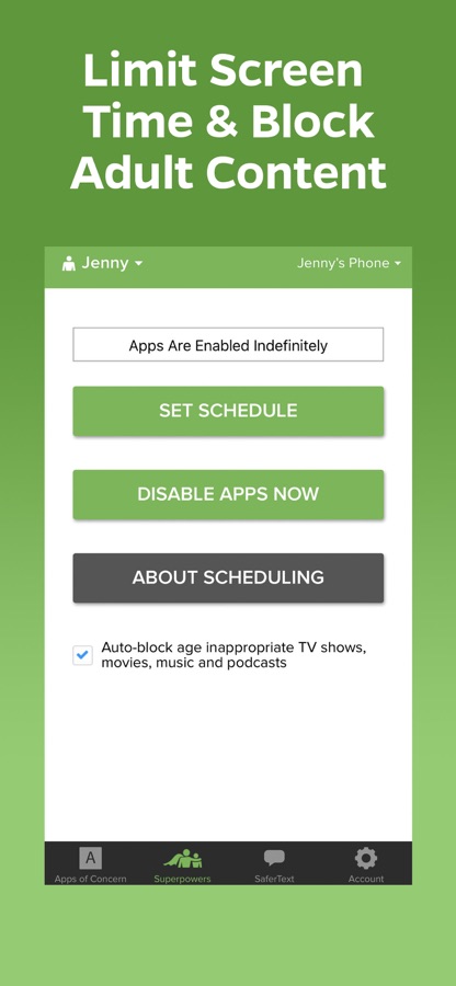 Parental Superpowers allow you to turn your children’s apps off at night, on a schedule, or any time. They also help you block adult content protecting children from inappropriate content.