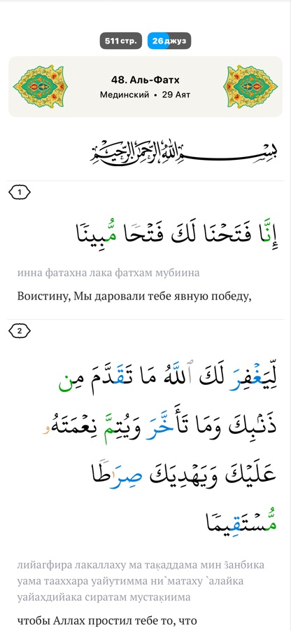 Читайте Священный Коран с переводами, транскрипцией, заметками, любимыми аятами и элегантными шрифтами. Продолжайте чтение с того места, где остановились.