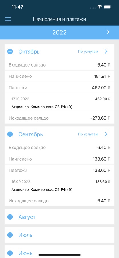 — история показания, счетов и платежей