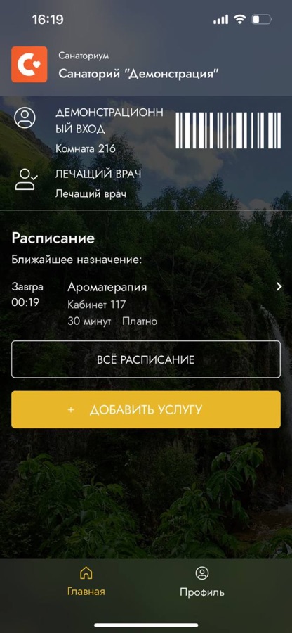 Мобильное приложение для гостей санаториев: позволяет получать общую информацию об услугах предоставляемых объектом размещения, уведомления о предстоящих посещениях и изменениях в расписании.