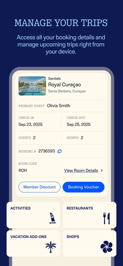 — Access your Sandals Select Rewards — See your member level, track nights to your next tier, and view your ID and point balance—anytime, anywhere.