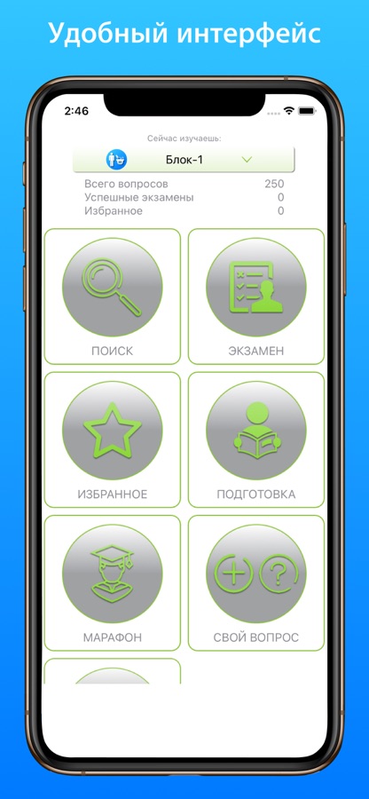 Приложение позволяет пройти тестирование по актуальным на данный момент разделам: