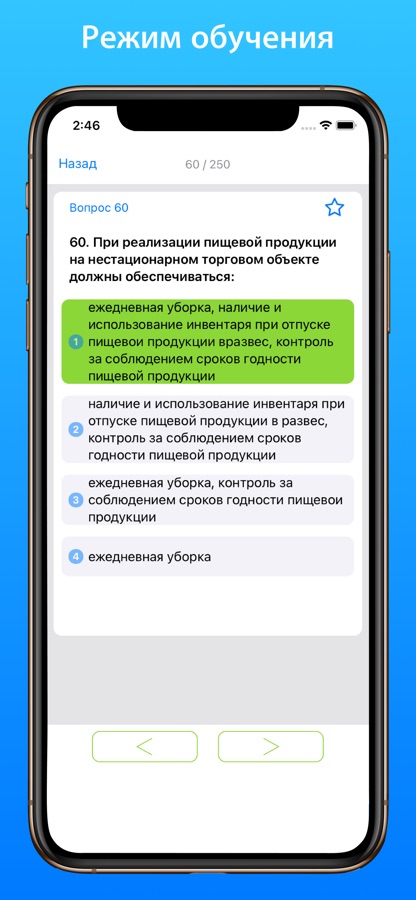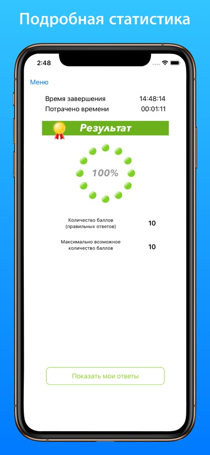 • Подготовка — Позволяет изучить вопросы в текстовом формате с отмеченными правильными ответами;