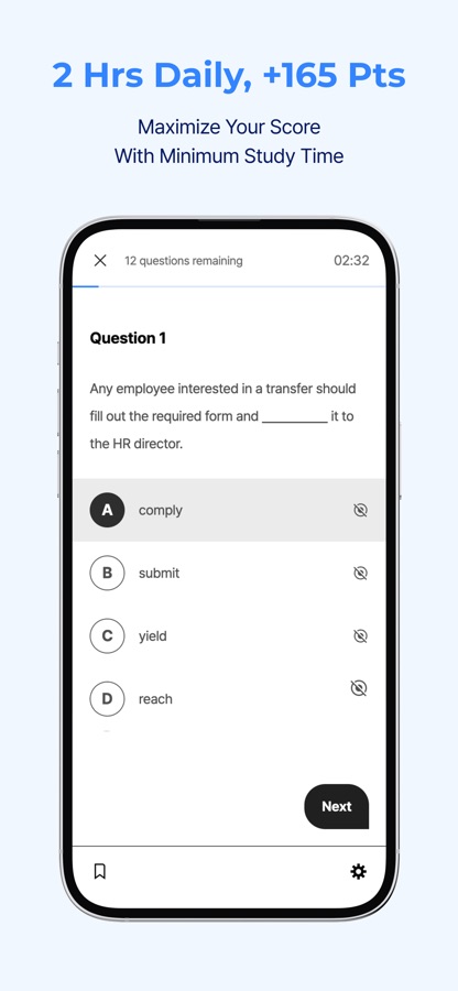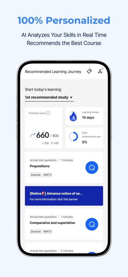 It will analyze your weaknesses by Part (Listening, vocabulary, grammar, etc.) and recommend a personalized study to increase your score in the fastest period.
