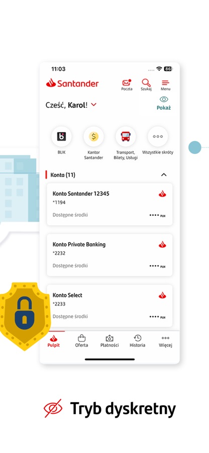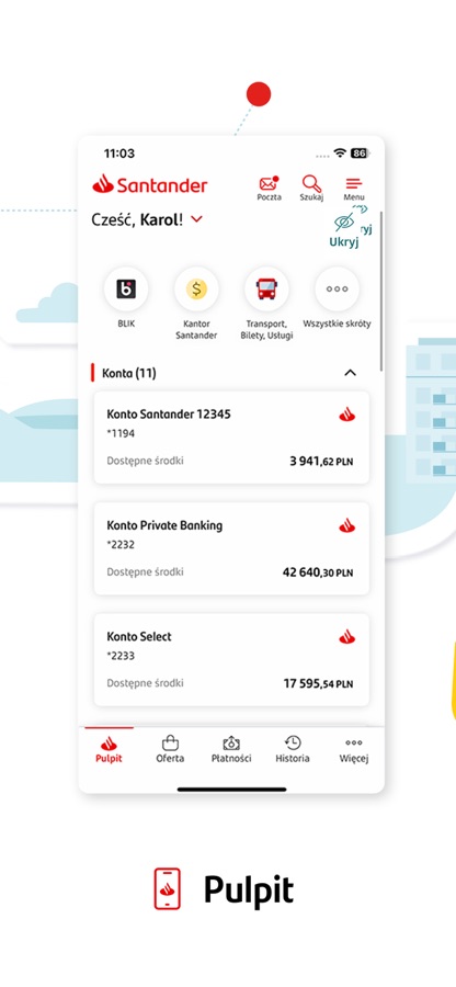 In the new version you will find account balance, transfers, Your products, BLIK, Santander open, Kantor Santander or the bank’s offer.