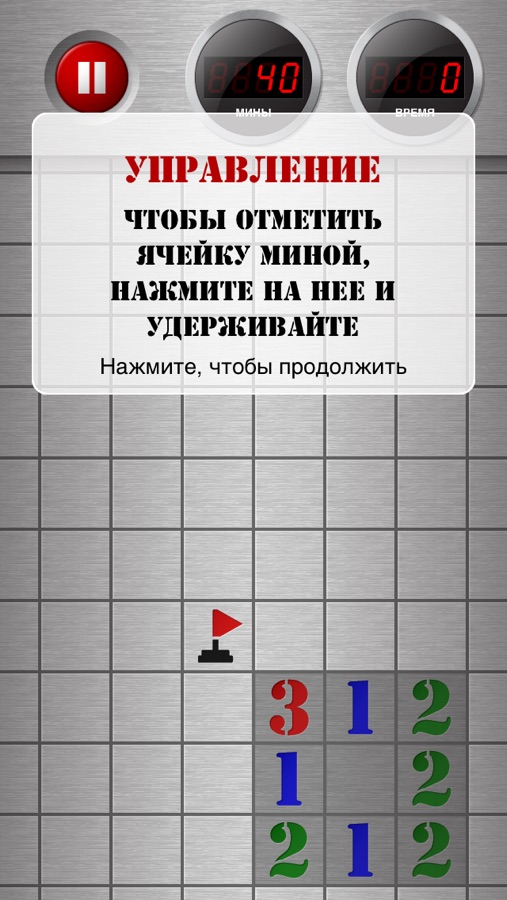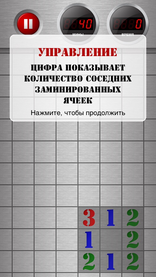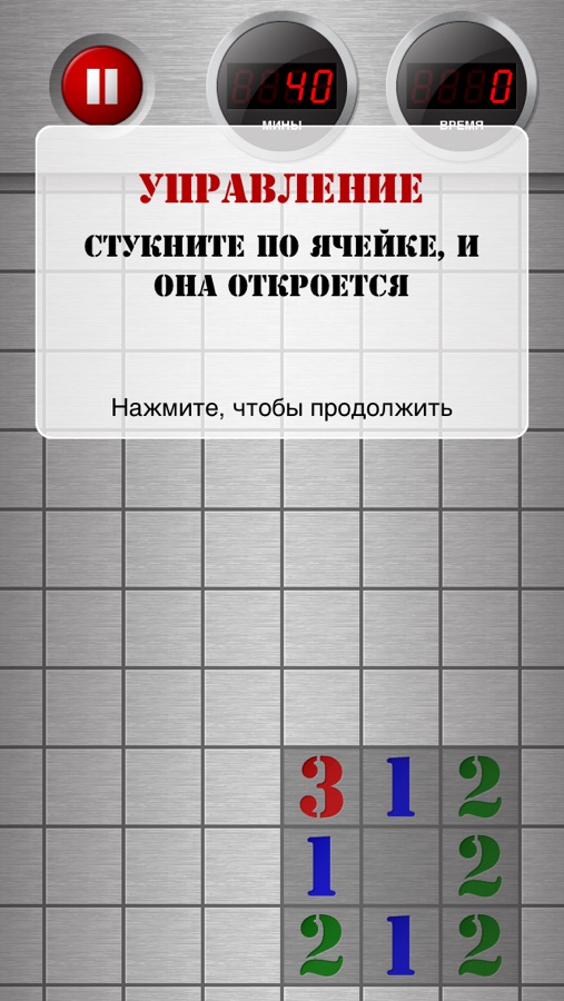 Правила просты: откройте все незаминированные ячейки и выиграйте. Стукните по ячейке — она откроется. Если под ней нет мины, вы увидите число, показывающее количество соседних заминированных ячеек. Если же под ней скрывается мина — взрыв. Чтобы отметить ячейку миной, нажмите на нее и удерживайте.