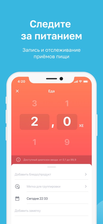 Мы знаем, как важно следить за тем, что потреблять в пищу. Поэтому для вас реализована возможность указывать количество потребляемых вами хлебных единиц и оставлять в заметках описание приемов пищи.
