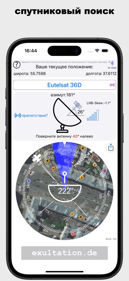 Приложение поможет вам выровнять вашу спутниковую антенну. На основе вашего местоположения и выбранного спутника приложение показывает вам, в каком горизонтальном и вертикальном направлении вы должны выровнять антенну. В качестве дополнительной функции вы можете проверить с приложением, если препятствия мешают приему.