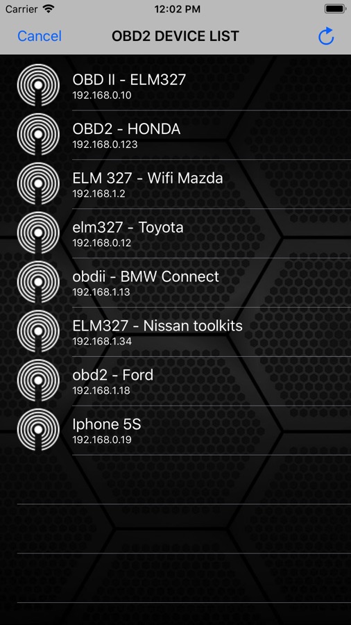 3. Launch your ScanMaster App. Click «Settings» for scan list OBD2 device and select correct your OBD device for diagnostics. (default is 192.168.0.10 or 192.168.0.123)