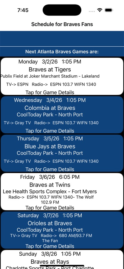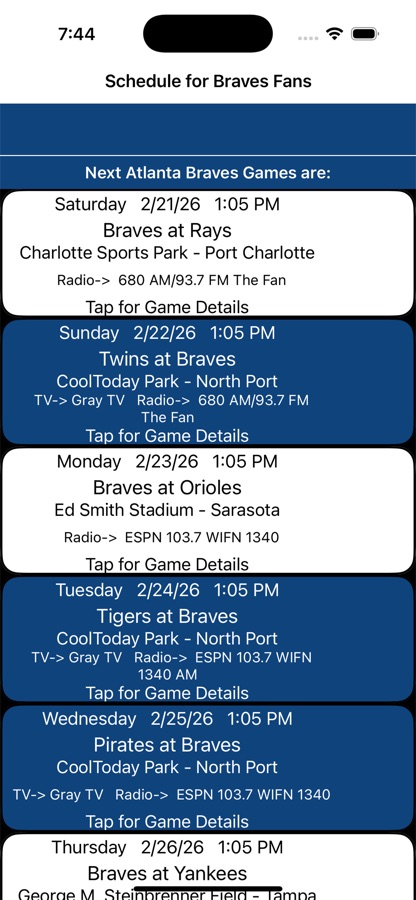 This app is a very quick and simple Baseball schedule for Atlanta Braves fans with TV and radio listings. Wicked die hard Braves fans will love this very fast, small, and free simple app. So when you are walking around Atlanta and someone says “Hey, do the Braves play tonight?» or «When is the next Braves game?”. One tap of your iPhone and there is the answer!!! No thumbing through old months, this app knows today’s date and quickly shows the next set of games from today’s date to the end.