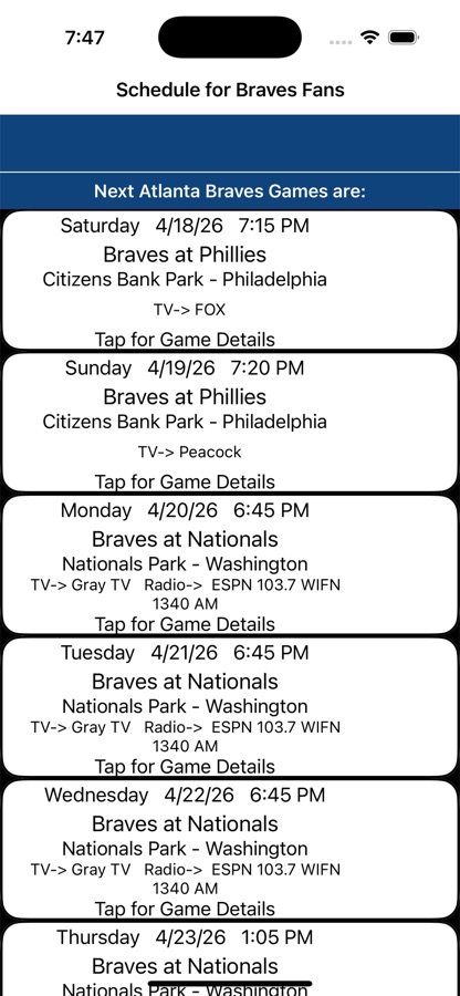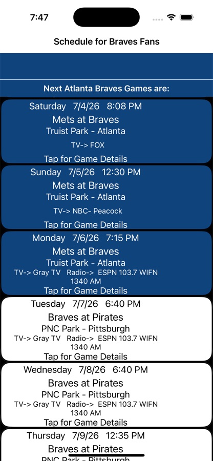 Note, if there are rain outs or double header make ups we may not have them in the schedule immediately, so if there is a rain out check the web site that day. This app has no official affiliation with the MLB or the Atlanta Braves.