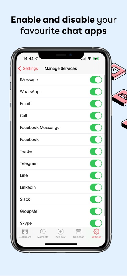 — Automate your texts through iOS Messages, WhatsApp, Telegram, Line, and Email (with iOS shortcuts).