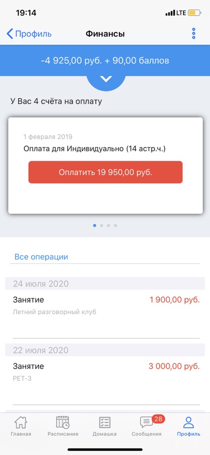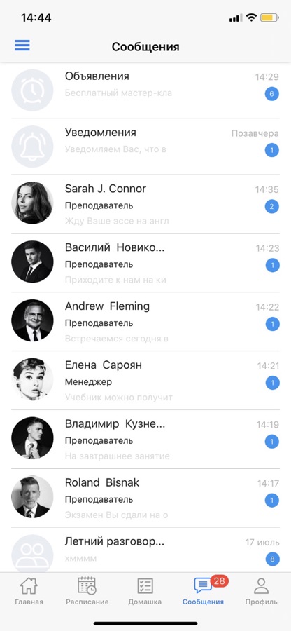 Здесь вы легко найдете всю информацию по своим занятиям: расписание, домашние задания, оценки, результаты тестов, учебные материалы. Здесь также есть чат группы и чат с преподавателем/менеджером учебного центра.