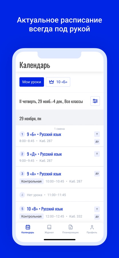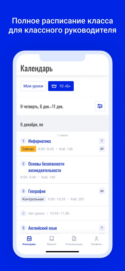 — Просматривать расписание класса, в котором учитель является классным руководителем;