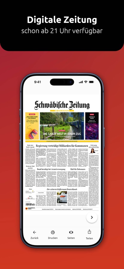 Für Ihre persönliche Leseerfahrung bietet die App Funktionen wie Dark Mode, individuell anpassbare Schriftgrößen, Zoom, Vorlesemodus, Lesezeichen und ein übersichtliches Archiv.