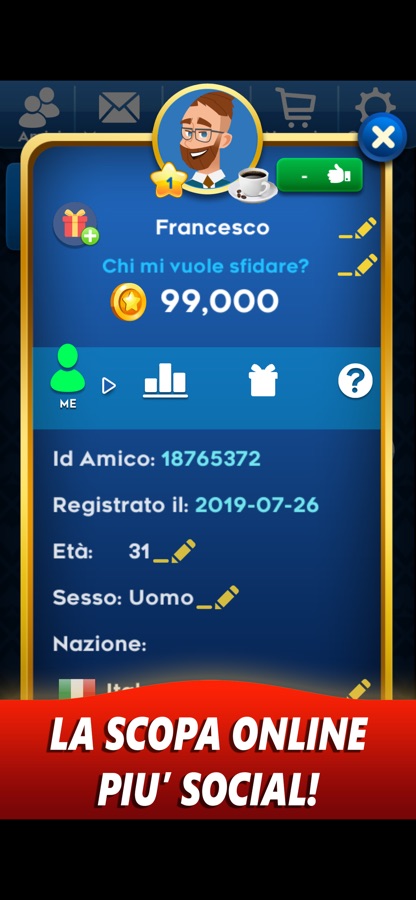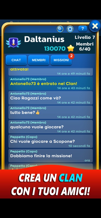 Questo non è solo un gioco di scopa ma anche una splendida community dove potrai chiacchierare con i tuoi amici con messaggi privati e dove potrai conoscere migliaia di nuove persone davvero simpatiche.