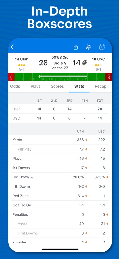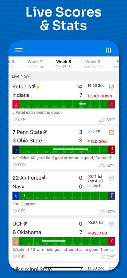 • Live College Football Scores & Stats – Real-time box scores, player stats, and team matchups.