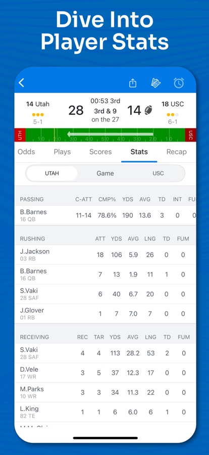 Get closer to the action with Superfan Sports for College Football – the ultimate app for NCAA fans and sports bettors. Get live college football scores, real-time play-by-play, in-depth college football stats, betting odds, news, and more — all in one clean, lightning-fast app.