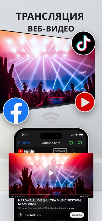 Функция стриминга видео работает как веб-браузер, позволяя искать и транслировать видео с YouTube, Facebook или других соцсетей.
