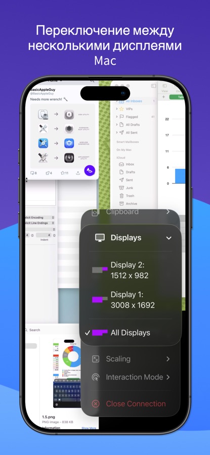 Выбирайте, какой дисплей просматривать на Mac с несколькими экранами, или отображайте все одновременно. Screens запоминает ваши предпочтения.