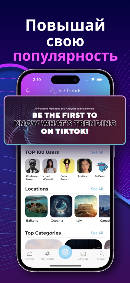 Отслеживать тренды, вирусную музыкы, звуки и ТОП блоггеров в Tik Tok еще никогда не было так просто. Наша платформа использует передовую технологию искусственного интеллекта для определения и отслеживания самых популярных трендов, новых звуков, инфлюенсеров, и всей аналитики в TikTok, чтобы вы могли быть всегда впереди, сохранять tiktok производительным и оригинальным. Независимо от того, являетесь ли вы инфлюенсером, креатором, талантом, маркетологом, smm менеджер или любителем контента, в SDTrends есть все необходимое, чтобы вывести Ваш Tik Tok на высокий уровень и повлиять на рост Ваших followers.