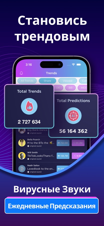 С помощью нашего приложения, Вы каждый день сможете найти самые вирусные звуки, как из любой точки мира, так и из любой категории бизнеса. Теперь Вам не нужно угадывать. Наша платформа представляет Вам все это в одном приложении, и поскольку все это создано как ТОП Чарты, вы также сможете выбирать насколько топовую музыкы Вам использовать и сколько предположительно охватов/фолловеров вы хотите получить в свой TikTok аккаунт.