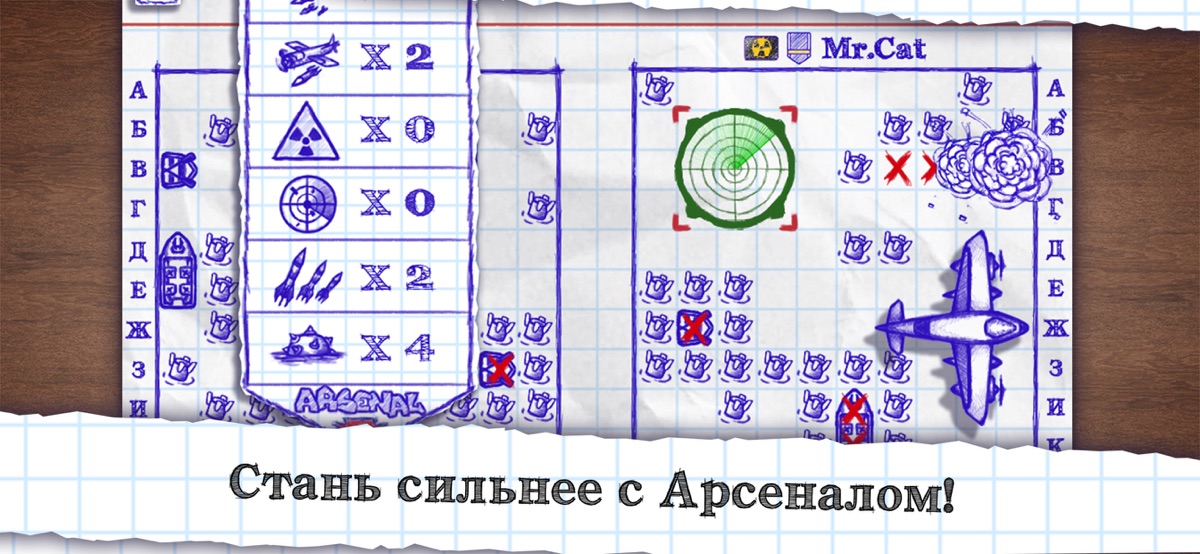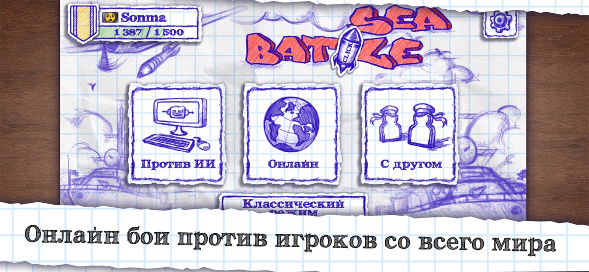 Морской бой — игра с красивой графикой в тетрадочном стиле и эффектами, что придаёт игре оригинальность и незабываемую атмосферу!