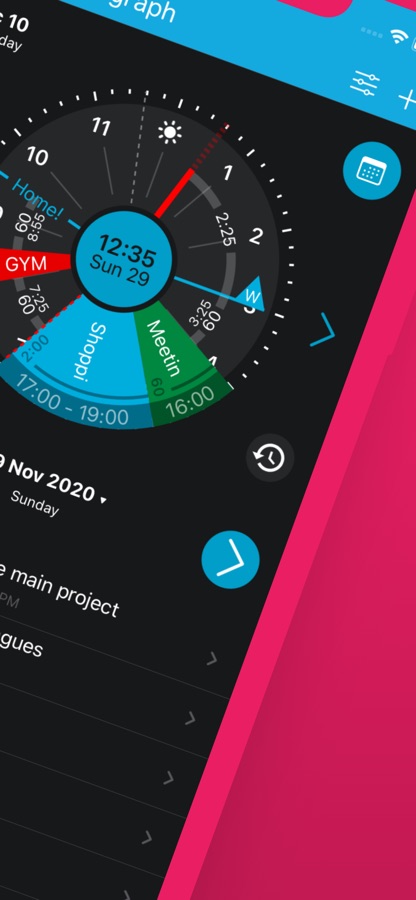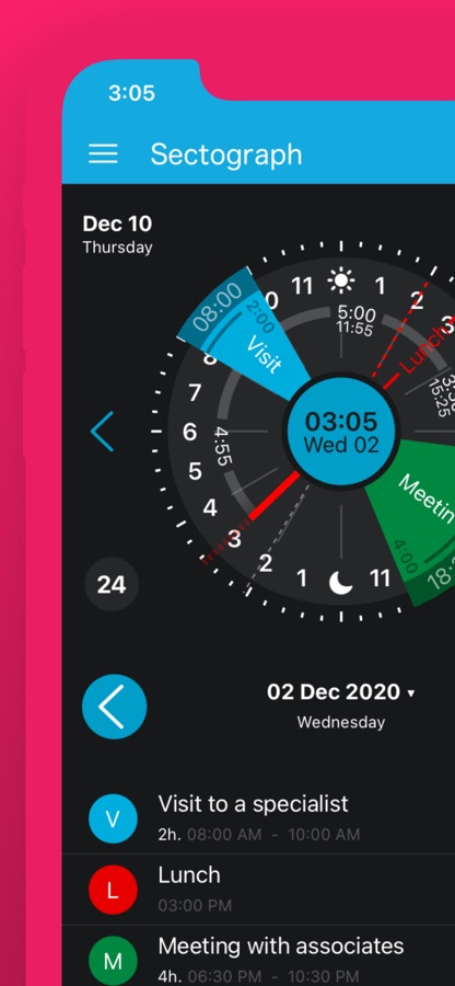 Sectograph — визуальный планировщик дня, отображающий события вашего календаря на круговой диаграмме в форме 12/24 -часового циферблата. Это другой способ взгляда на день