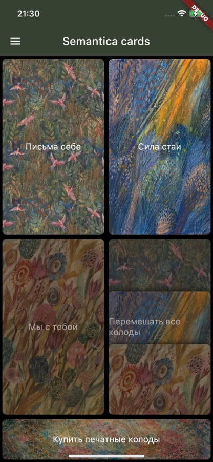 В приложении представлены электронные версии колод “Письма Себе” (66 карт) и “Сила Стаи” (мини-версия 18 карт) — удобная форма любимых наборов, которая всегда под рукой. В любой момент, когда вам нужна подсказка на пути, просто достаньте свой смартфон.