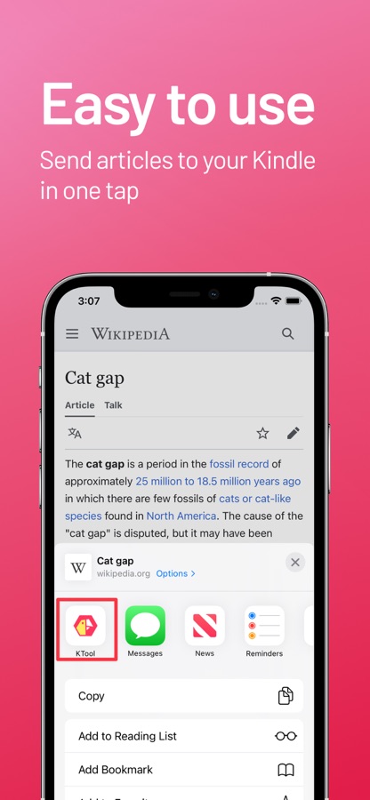 Installing this app will add a KTool Share Target to your mobile phone. Share articles with KTool Share Target to read them on your Kindle.