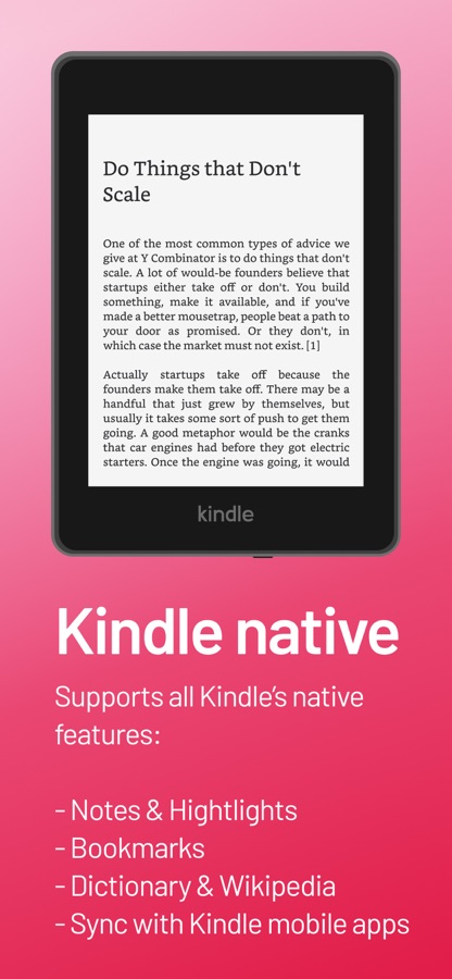 Send long web articles to your Kindle to read later. Read anywhere: on your Kindle e-reader or the Kindle app on your smartphone (any platform). Articles are available for offline reading once delivered to the Kindle.