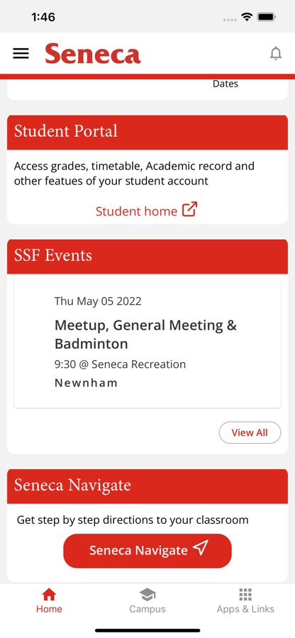 Get info and updates on-the-go including: Seneca News, Shuttle Bus schedule, SSF events, CafeQ, Travel plan for airport pickup service and more.