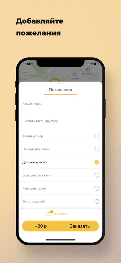 Добавьте к заказу дополнительные пожелания. Например, когда на улице +35 — выберите «кондиционер». Если вы не переносите запах табака — укажите «Некурящий салон», и к вам приедет некурящий водитель.