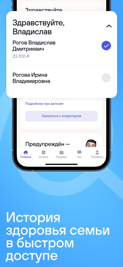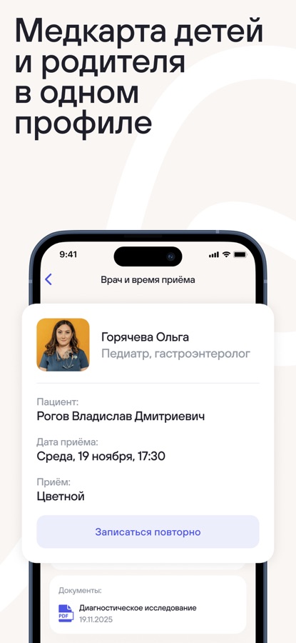 Управляйте здоровьем семьи и близких в приложении сети клиник docdeti & docmed & docdent. Авторизуйтесь под вашим номером телефона и датой рождения, чтобы просматривать рекомендации врача, управлять записями на приёмы и общаться с врачами и Службой Заботы в защищённом чате