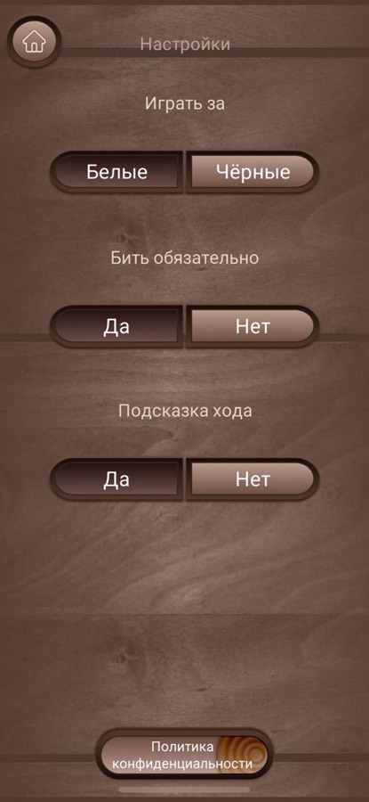 В настройках игры, вы можете выбрать за какой цвет шашек играть, за белые или черные. Так же есть настройка «бить обязательно». Есть стоит «Да», то она подразумевает, что шашку под боем нужно обязательно бить.