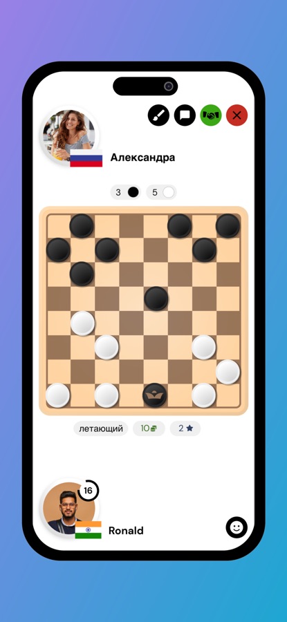 Общайтесь с людьми с помощью мессенджера в приложении. Отправляйте смайлики и заводите новых друзей, разделяющих страсть к шашкам и настольным играм.
