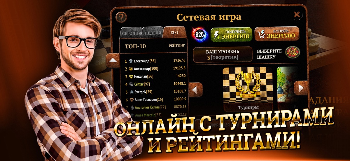 Такая тонкая настройка делалась под бесплатную онлайн игру, в которой вы можете сразиться с игроками со всего мира. В этом режиме вы будете получать новые уровни и звания, что позволит разблокировать шашки с дополнительный раскраской, а также даст возможность поучаствовать в турнирах с хорошими наградами. В онлайн игре можно сыграть как с другом, так и с незнакомым соперником. В случае победы вы попадаете в ежедневный, еженедельный и общий рейтинг, где можете сравнить свои достижения с другими участниками.