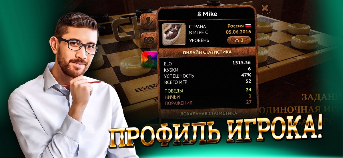 • Шашки онлайн с рейтингами игроков (в том числе ЭЛО), возможностью прокачки и получения званий