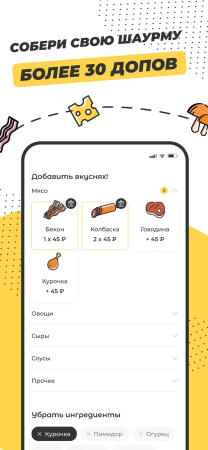 Сделайте свою шаурму ещё культурней: с лёгкостью вносите изменения в существующие рецепты или создайте свой авторский, а мы приготовим специально для вас. В приложении большой выбор дополнительных ингредиентов: бекон, ветчина, опята, оливки, фетакса, хэшбраун, жареный лук и много чего ещё!