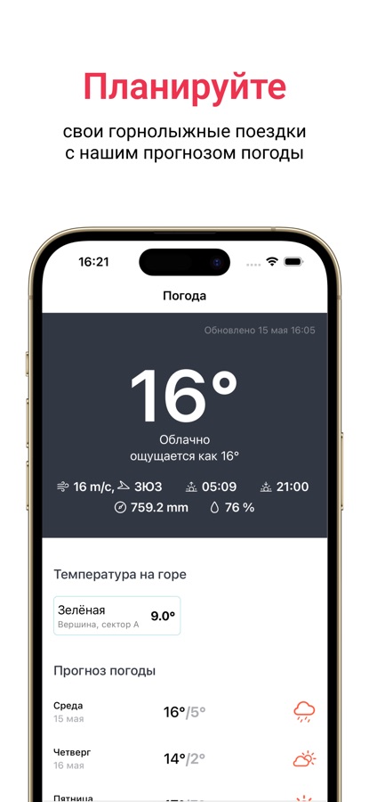 В приложении в режиме онлайн представлены ключевые точки горнолыжного курорта Шерегеш: трассы, станции подъемников, отельный городок. Вы сможете в реальном времени оценить снежный покров, количество посетителей, очереди на канатные дороги, погоду у подножья и на вершинах гор (да, она может существенно отличаться).