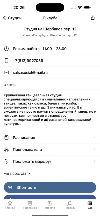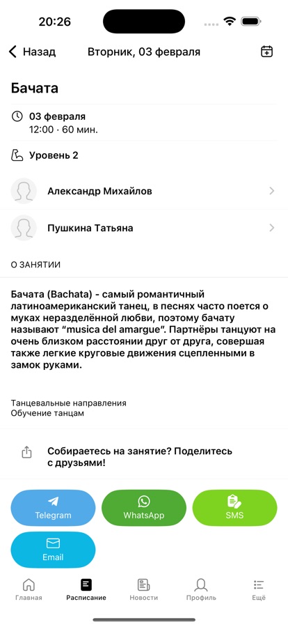 С помощью приложения вы можете следить за новостями, расписанием занятий, проводимыми вечеринками, мастер-классами и семинарами, оперативно получать информацию об изменениях в расписании и специальных предложениях.