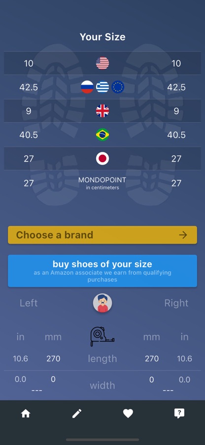 — конвертер размеров, если вы знаете длину стопы (Pro, ограниченно бесплатно или через рекламу)