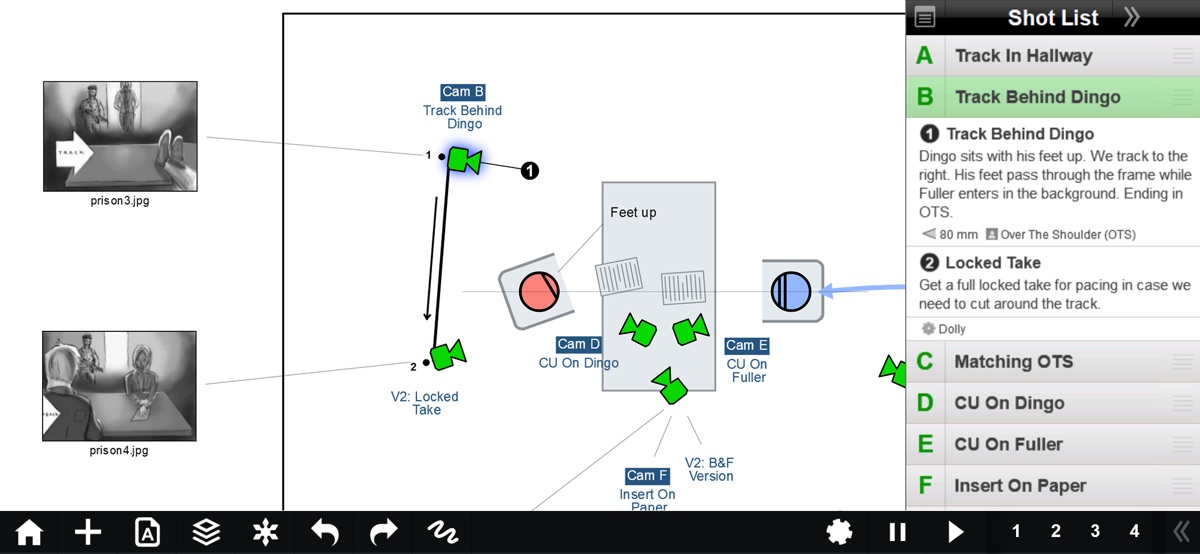Shot Designer is based on the realization that neither Camera Diagrams, Shot Lists, or Storyboards by themselves give you a satisfying understanding of camera-blocking — you have to use them *together*.