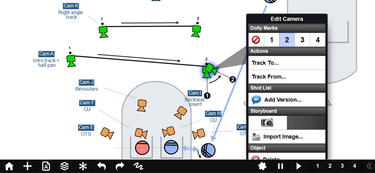 • CAMERA DIAGRAM — Shot Designer dramatically speeds up the Director’s process of making camera diagrams. Create full-blown diagrams in seconds. The software does most of the work.